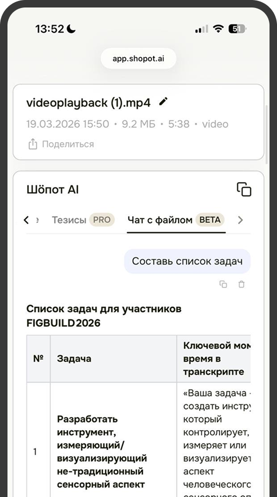 Полноценно участвуй в переговорах, шöпот составит стенографию встречи и подготовит краткое содержание с помощью самого современного искусственного интеллекта
